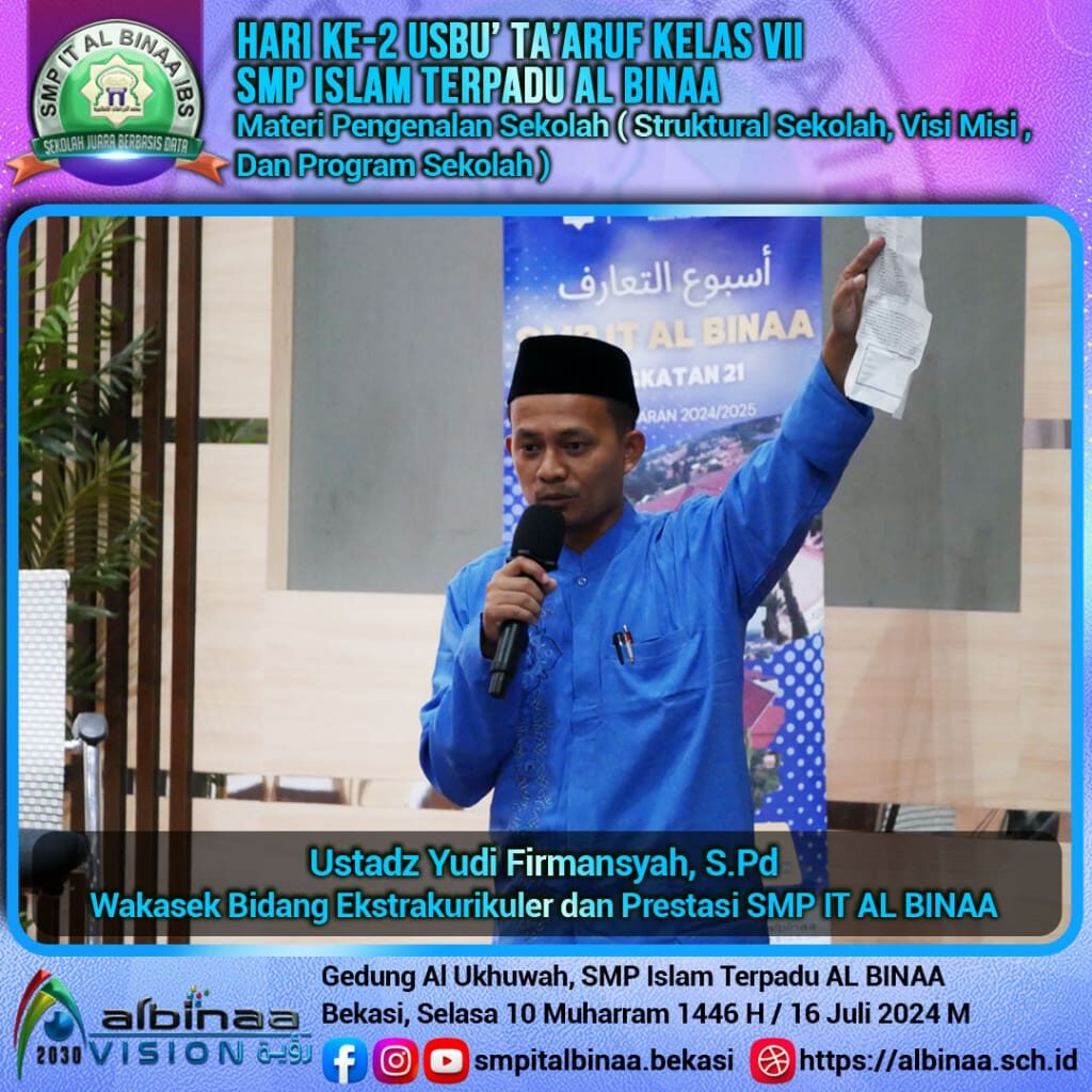 Kemudian pada pukul 09.00 wib para santri menuju Gedung Ukhuwwah untuk mengikuti sesi selanjutnya yaitu materi pengenalan lingkungan sekolah, sruktural, visi misi, dan program kerja SMP Islam Terpadu Al Binaa. Adapun pematerinya adalah Kepala Sekolah, Ustadz Dr. Sulaeman, S. Pd., M.M. didampingi oleh para wakasek di beberapa bidang yaitu kesekretariatan, kurikulum dan pengajaran, kesiswaan dan pembinaan karakter, sarana prasarana, ekstrakurikuler dan prestasi, humas dan media informasi komunikasi.
